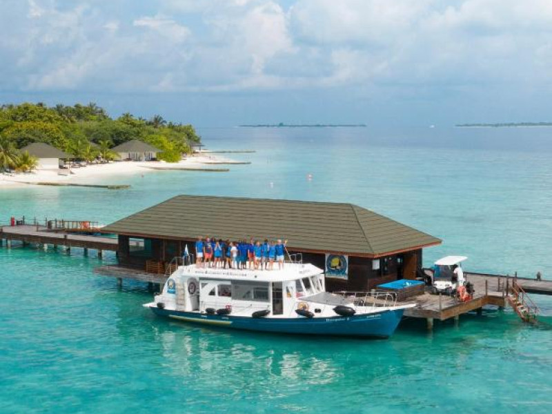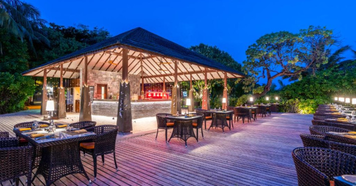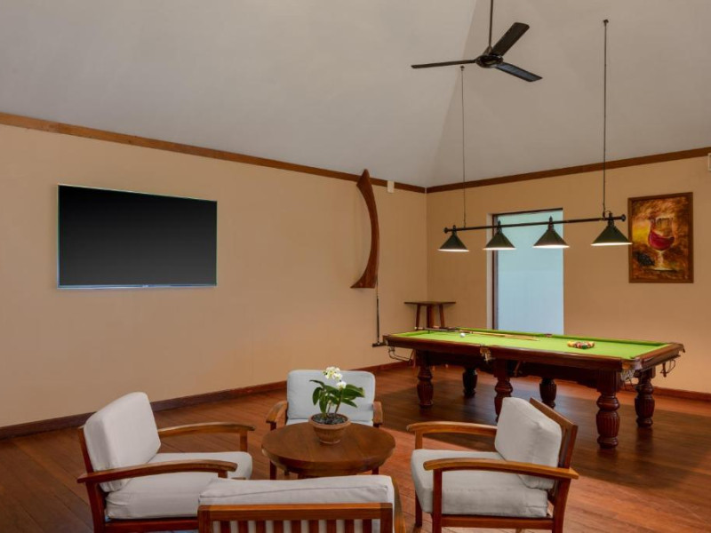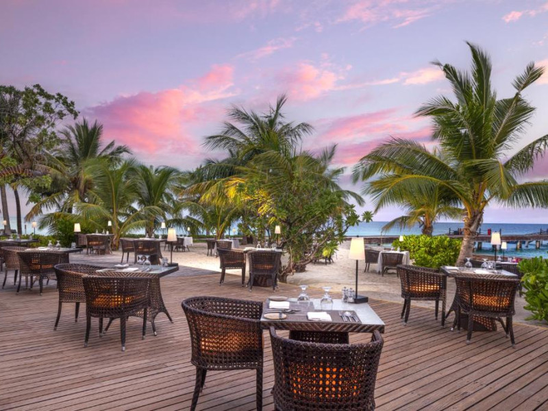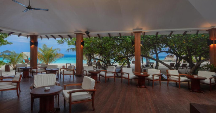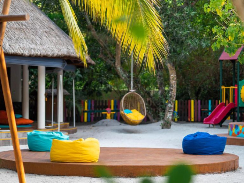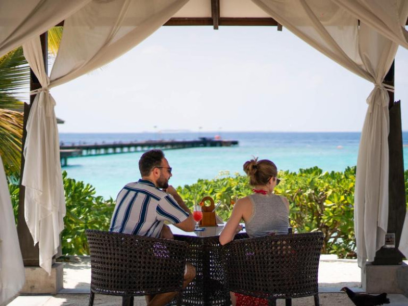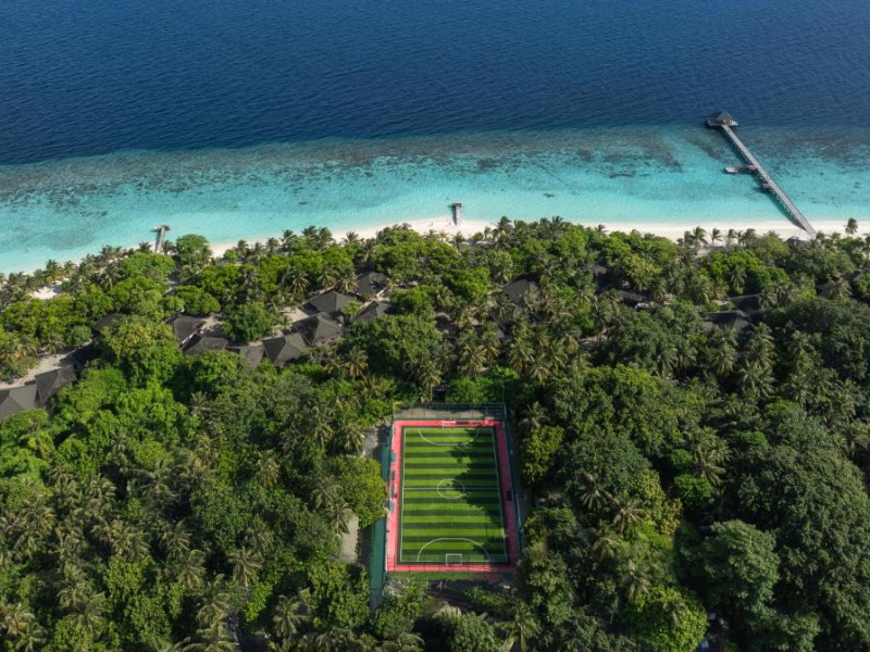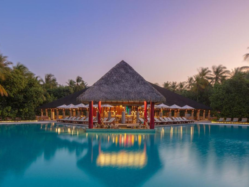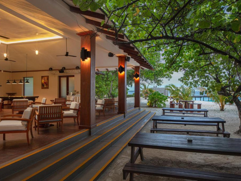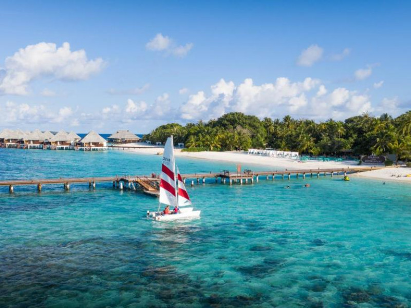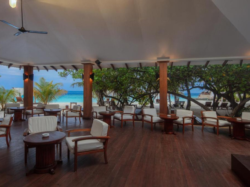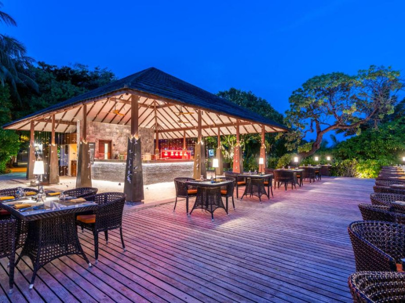 Facilitățile includ restaurant cu bucătărie internațională, bar pe plajă, centru de sporturi nautice și spa. Oaspeții pot practica snorkeling și diving direct de pe insulă, explorand recifele de corali din apropiere.