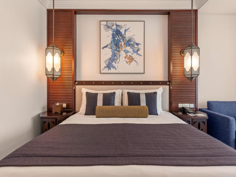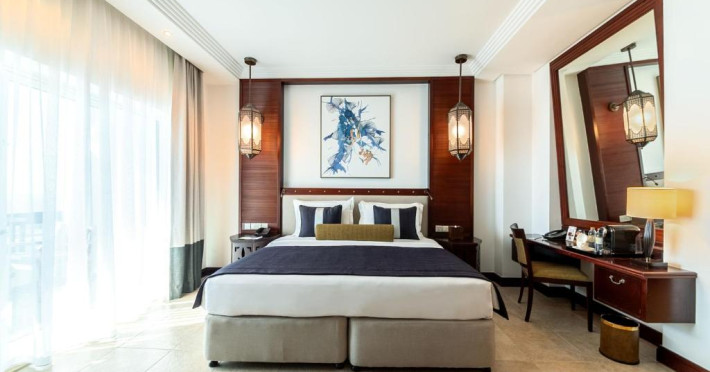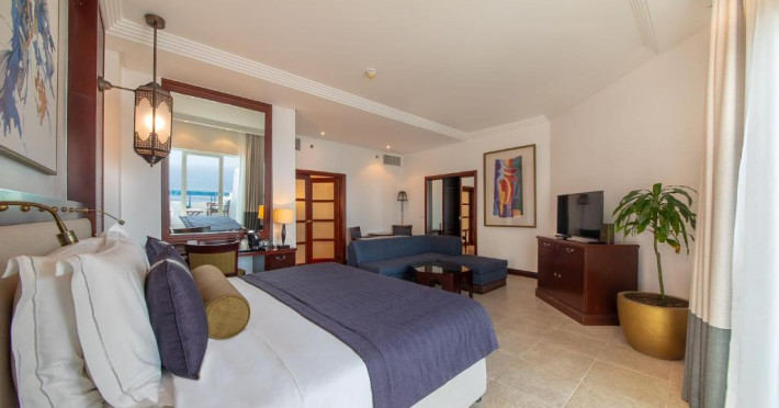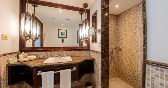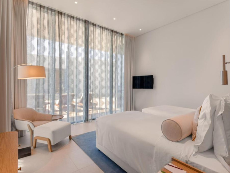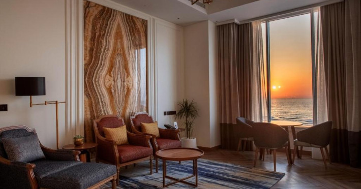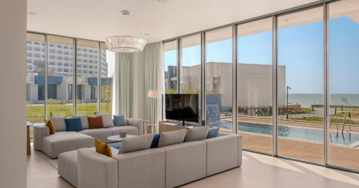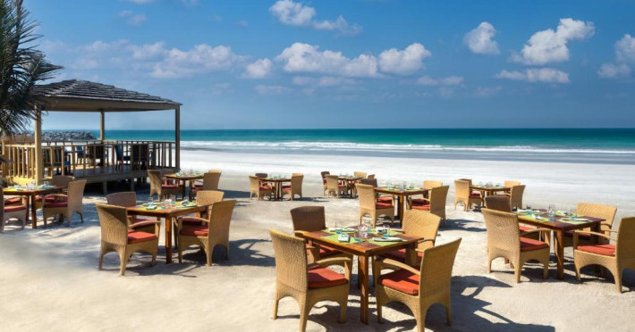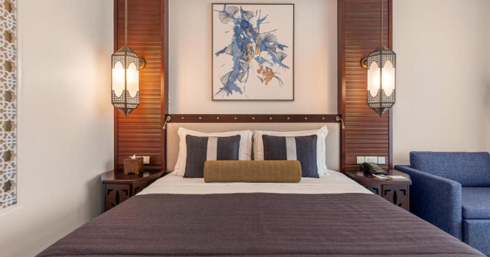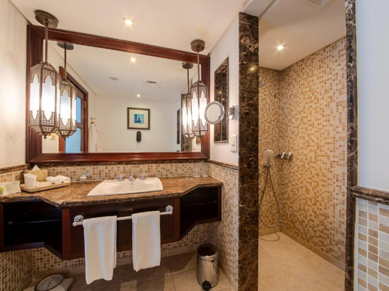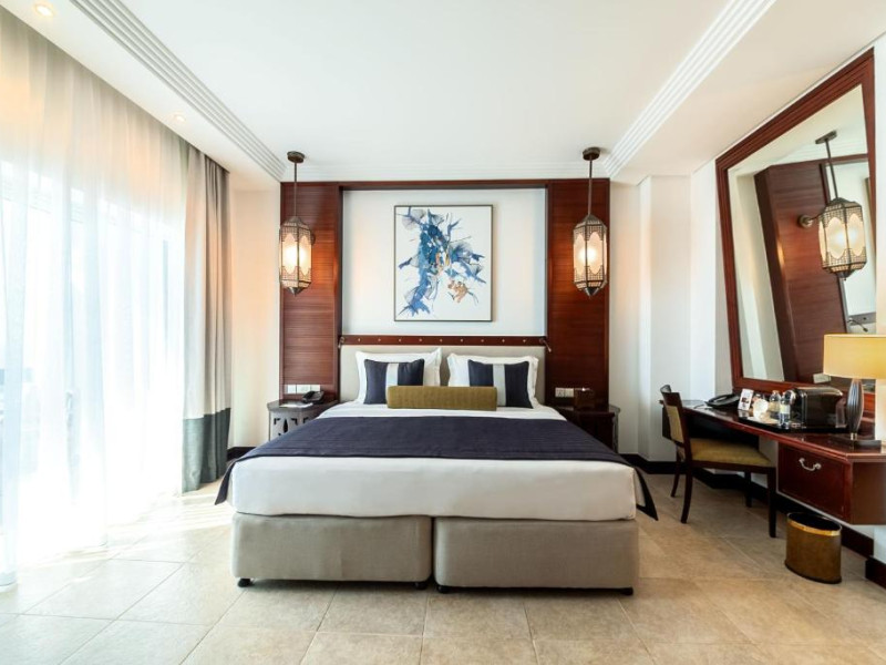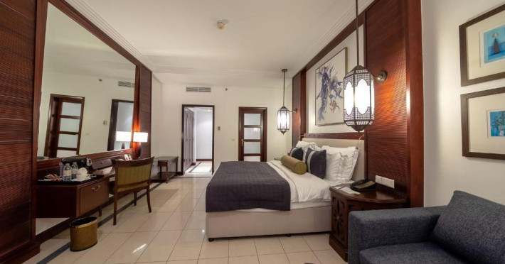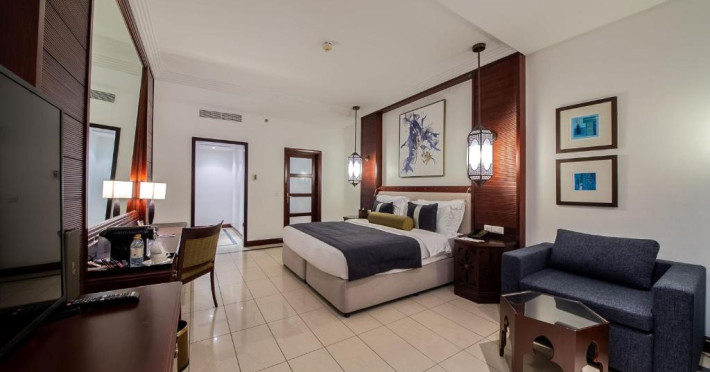 Camerele au scheme de culori luminoase și mobilier din lemn elegant, in stil oriental. Camerele și suitele elegante duc spre un balcon sau o terasă privată, mobilată. Vederea panoramică are vedere la Golful Persic și la grădina luxuriantă amenajată.
