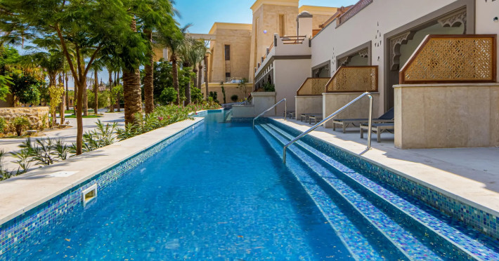 Arhitectura in stil palatial și grădinile luxuriante creează o atmosferă de eleganță orientală autentică. Oaspeții beneficiază de piscine infinity cu vedere la mare, centru spa cu tratamente tradiționale egiptene și moderne, precum și multiple restaurante cu specific internațional și local.