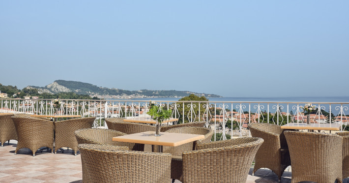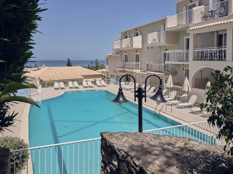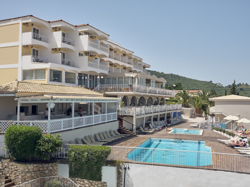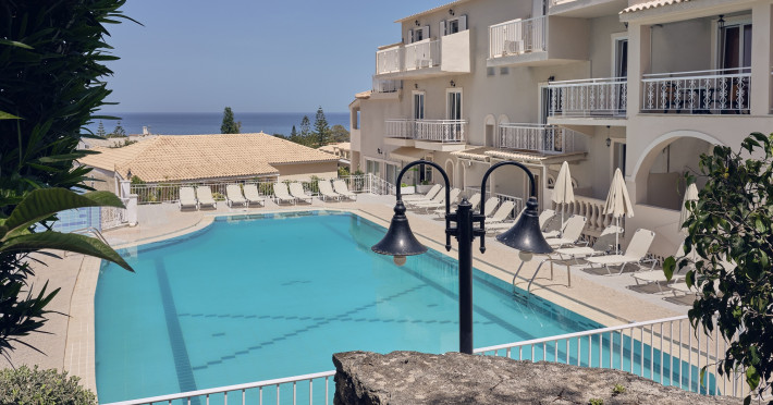 Captains Commodore boasts a hilltop location in the coastal region of Agrassi, approximately 500 meters from the beach. This recently renovated hotel offers all inclusive accommodation in a variety of room types, each featuring a private bathroom and a balcony or terrace with sea or pool views.