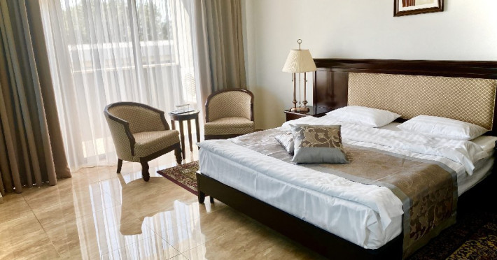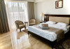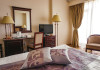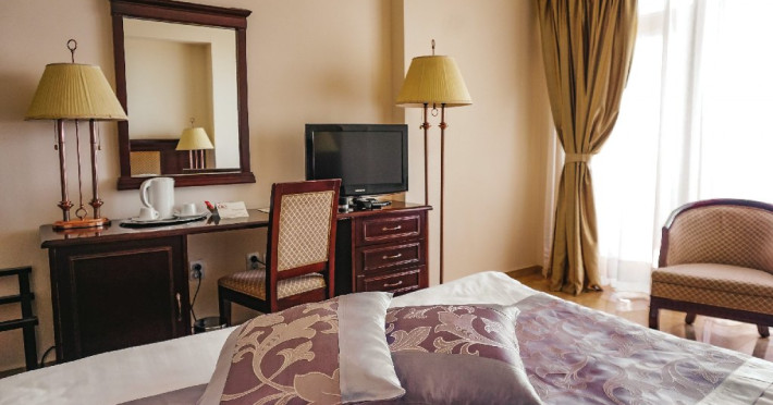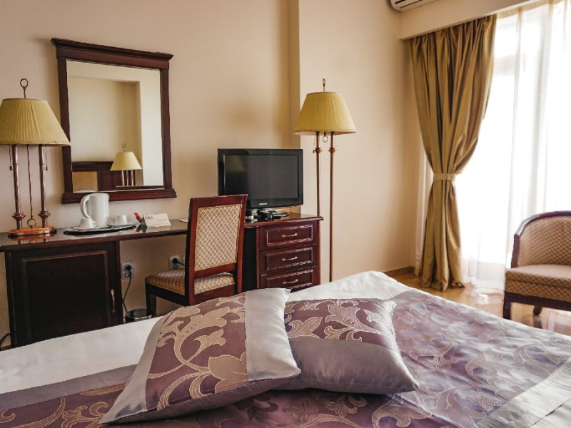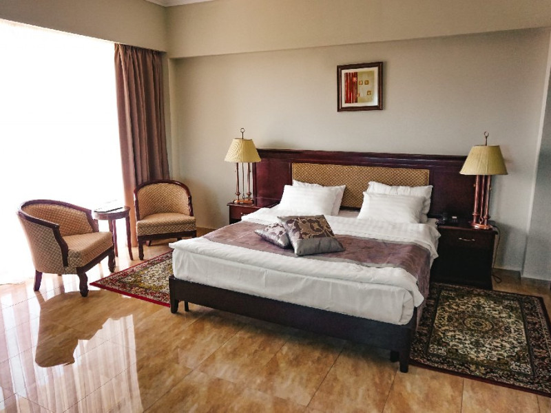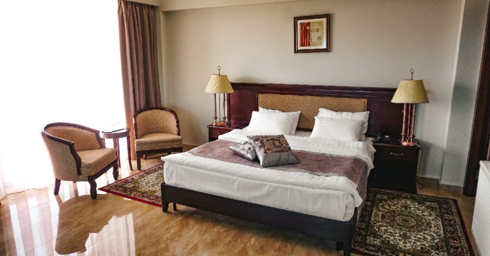 Dotari camere Camere elegant mobilate, cu balcoane spatioase de 7.5 mp (dotate cu masuta si fotolii), aer conditionat, minibar, seif, grup sanitar cu cabina de dus, uscator de par, 2 telefoane in camera si baie, LCD, internet gratuit.