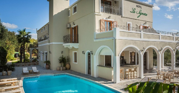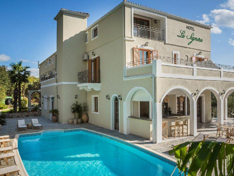 Hotelul nostru este situat in satul pitoresc Lourdata, pe un deal luxuriant sub miticul munte Aenos, cu vedere la albastrul Marii Ionice, la care se ajunge in doar 3 minute. Hotelul a fost deschis pentru prima data in anul 1990 sub numele LARA HOTEL. Odata cu schimbarea managementului, anul trecut, acesta a fost redenumit Hotel La Signora, marcand inceputul unei noua ere, precum si noua sa filozofie in ceea ce priveste ospitalitatea, serviciile si facilitatile acestuia. Cele 37 de camere ale noastre acopera toate nevoile de cazare, fie ca au vedere la mare maiestuoasa, fie la muntele impunator, fie la livada de maslini de culoare verde-argintie sau la aleea satului, toate sunt ingrijite pana la cel mai mic detaliu, avand toate facilitatile necesare. Avem zone interioare si exterioare unde va puteti bucura de un mic dejun copios si energizant, precum si de mese delicioase pe tot parcursul zilei, din meniul nostru bine conceput. Lounge-ul nostru relaxant va invita la o discutie, la jocuri de societate sau la o mica pauza. In veranda noastra mare, cu vedere la mare si la munte, cu multa lumina atat de la soare, cat si de la luna si stele, va puteti bucura de cocktail-uri inovative de la barul nostru vesel, in timp ce inotati in piscina noastra atragatoare sub cerul grecesc inegalabil sau admirand amurgul unei alte zile frumoase sau distrandu-va in noptile unice pe care le pregatim, special pentru tine. Dorinta noastra este sa te gazduim, sa avem grija de tine si sa te facem fericit. Va asteptam, cu mare drag!