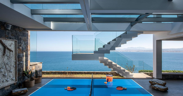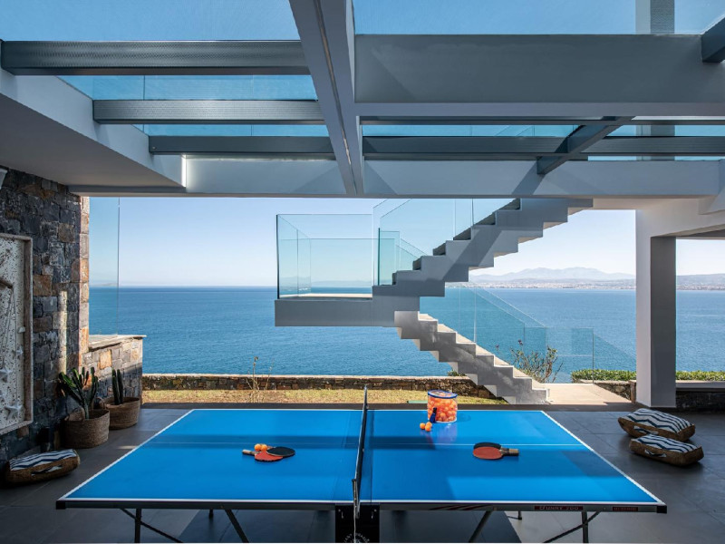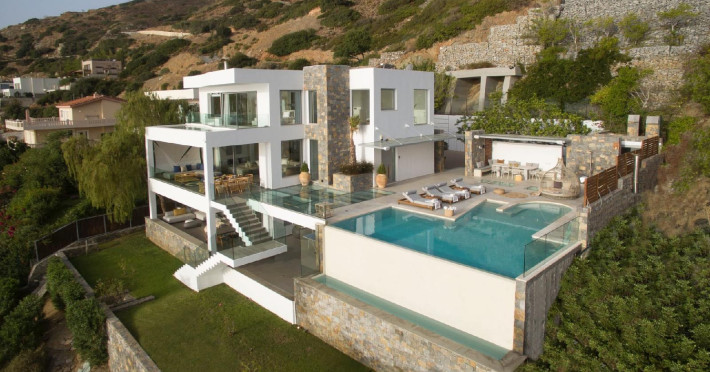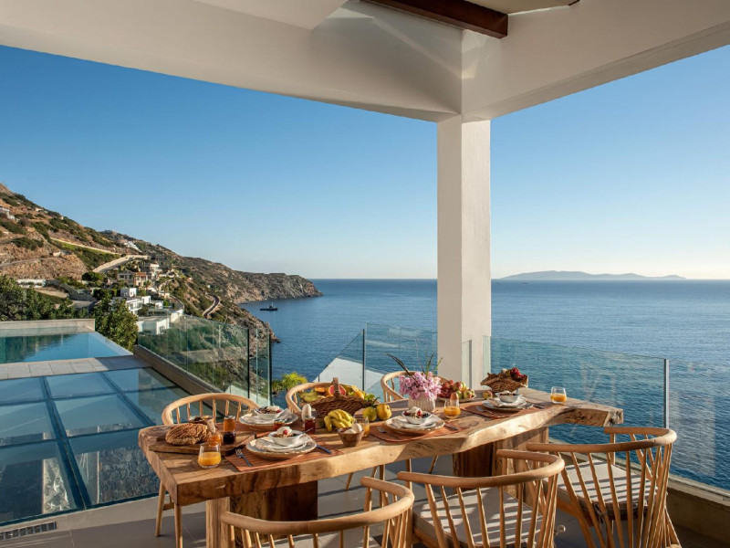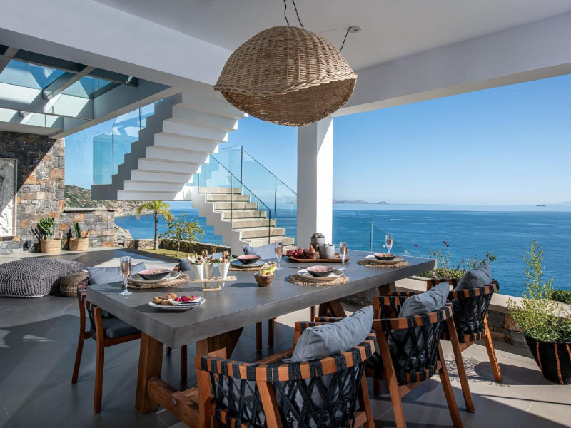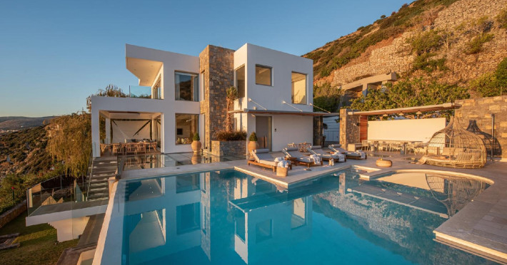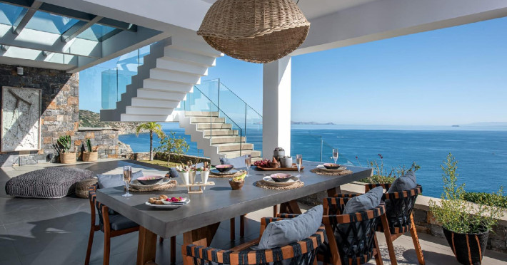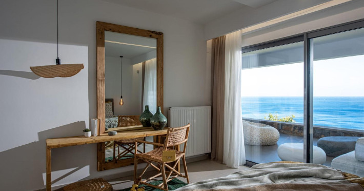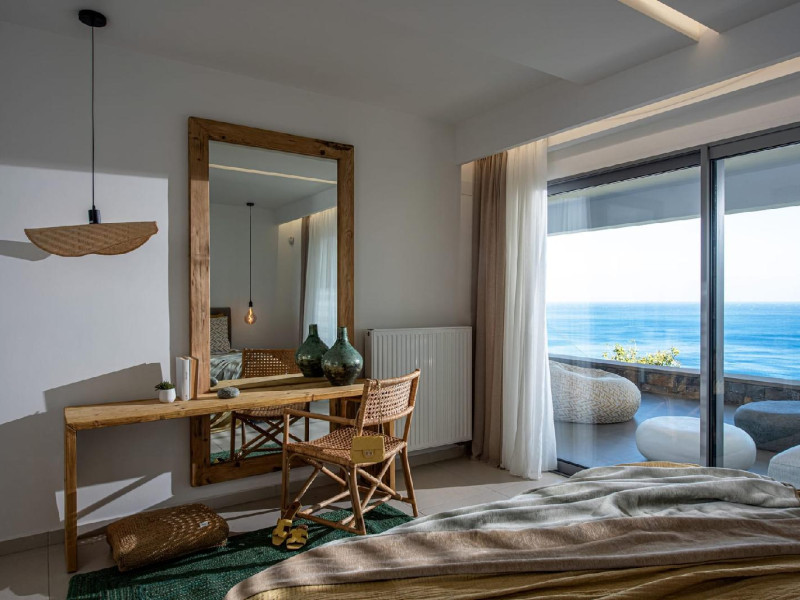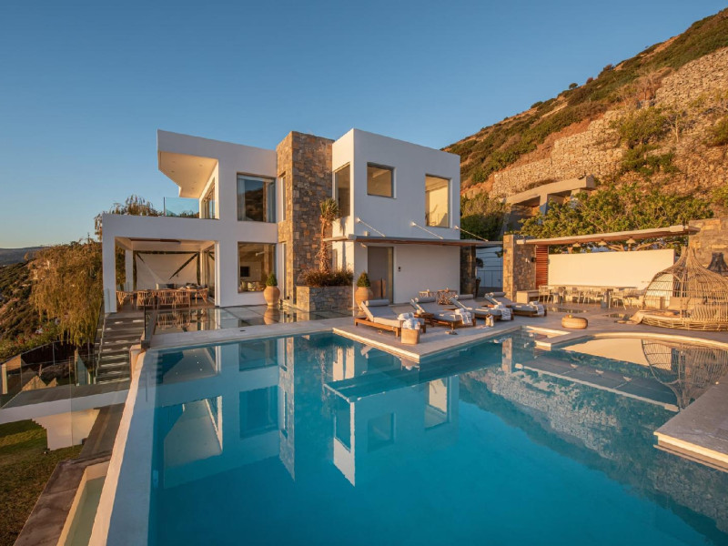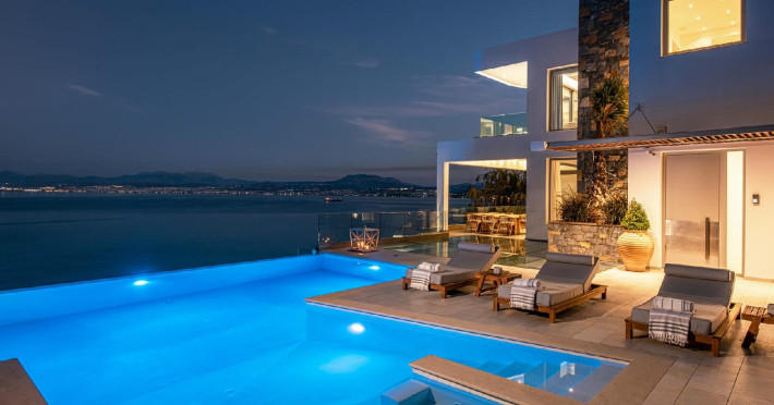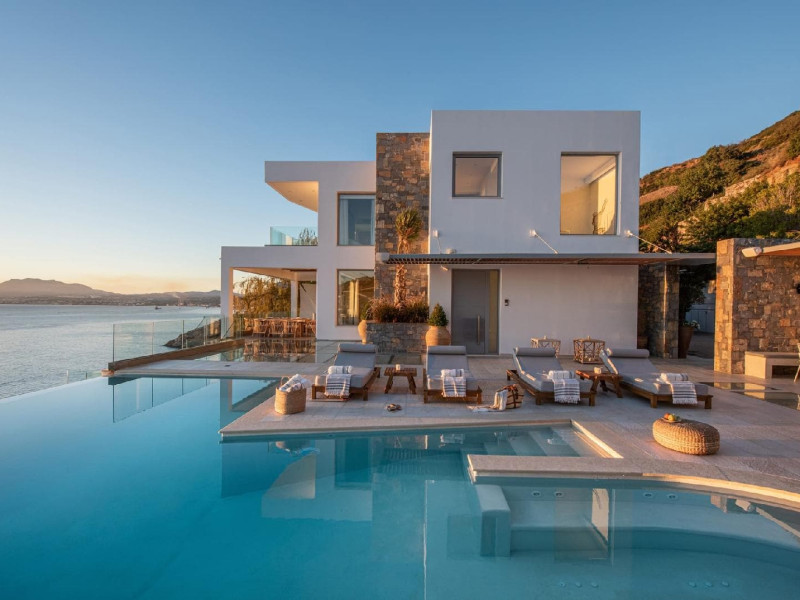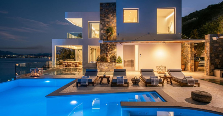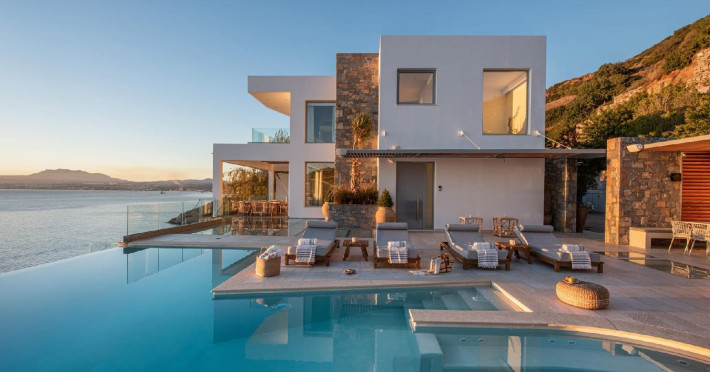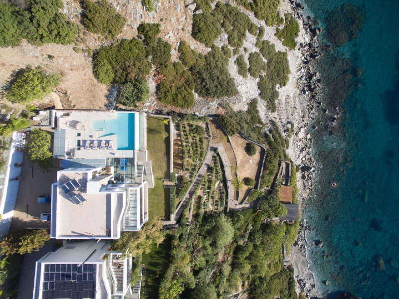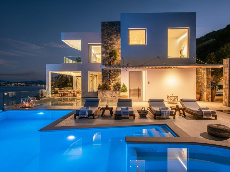 Lady Sea is a 6 Bedroom Sea View Villa in Palaiokastro, Crete, which unfolds in three levels and blends wisely into the beautiful Heraklion landscape, offering complete privacy and impeccable sea views to its guests. It is an ideal hideaway to unwind while discovering Crete; an island where nature, history, and heart-warming hospitality meet. All interior and exterior spaces of the Villa are outlined in dialogue with the impressive sea views, creating indulging relaxing areas that celebrate the outgoing Mediterranean lifestyle. Built on an approximately 2,000 m2 plot, the Villa has an independent entrance, while an indoor elevator and outdoor staircase connect the different levels. Max Capacity: 12 – 14 (Max Adults 12) Villa’s Square Meters: 496 m2 (2,000 m2 plot) Villa’s Square Meters with Outdoors: 2.350 m2 Three Floors: connected by an indoor elevator and staircase. There is an outdoor staircase connected First and Second Levels Bedrooms: 6 Bedrooms & 2 extra beds Bathrooms: 7 full bathrooms and 1 WC (6 ensuite bathrooms with showers, the master bedroom has shower & bathtub) Large Infinity Swimming Pool: 50m2 with built-in jacuzzi Private secure open parking Indoor Elevator Direct Access to a Private Sandy Beach