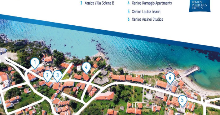 Descriere: Complexul Loutra Village este situat in Loutra Agia Paraskevi, inconjurat de verdeata, aproape de mare si compus din trei proprietati: Vila Solena clasificata la 3 key - Apartamente (15 camere) Apartamente Karnagio clasificata la 3 key (11 camere) Elissavet Studios clasificata la 2 keys (8 camere) Localizare: La cativa pasi de plaja. Facilitati hotel: aer conditionat, receptie.Dotari camere: chicineta, frigider, TV satelit, balcon, aer conditionat Website: http://loutravillage.gr/xenios-villa-solena