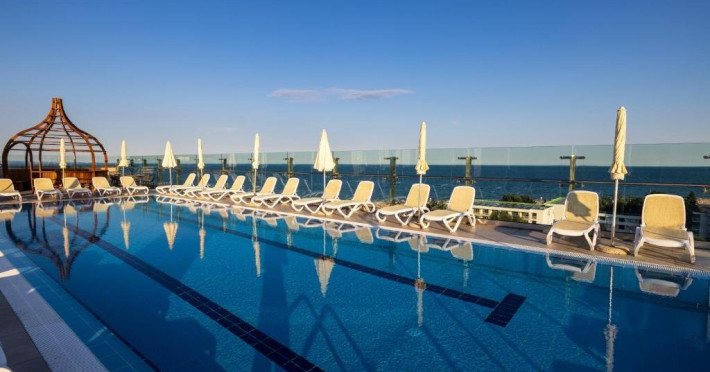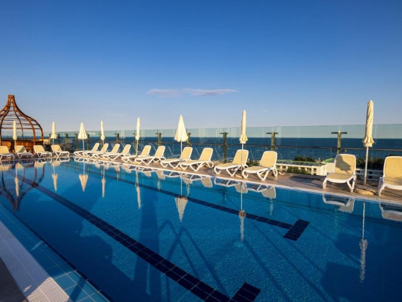 Localizare: Situat doar la cativa metri de plaja, in inima resortului Albena. Facilitati hotel: Hotelul pune la dispozitia clientilor restaurant, piscina rooftop la etaj superior, piscina pentru copii Mini Splash la Maritim Paradise Blue, piscina interioara si sala de sport la Wellness Center Maritim Paradise Blue - toate piscinele sunt cu apa minerala. Bar si pisicna pe acoperis, acces exclusiv pentru camerele si apartamentele Executive (etajele 7 si 8). Animalele nu sunt permise. Dotari camere: Camerele sunt dotate cu aer conditionat, seif, TV, mini bar, balcon. Camerele Deluxe cu vedere la mare sunt situate la etajele 5 si 6. Camerele Deluxe cu vedere la gradina sunt situate de la etajul 1 pana la etajul 4. Site web: https://albena.bg/ro/maritim-hotel-amelia
