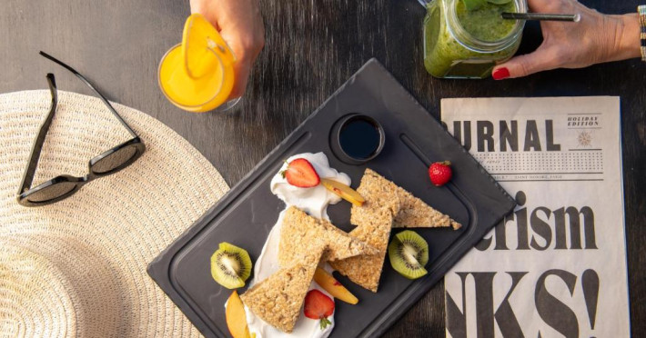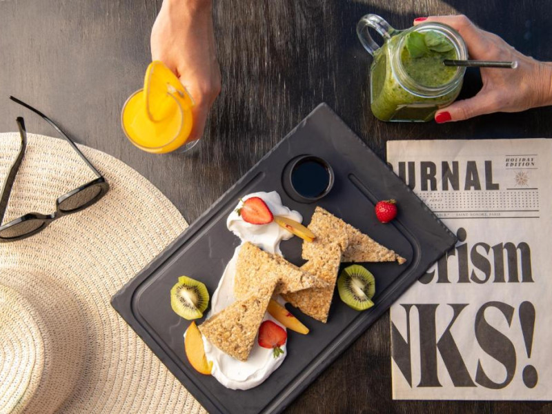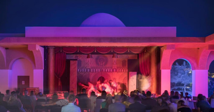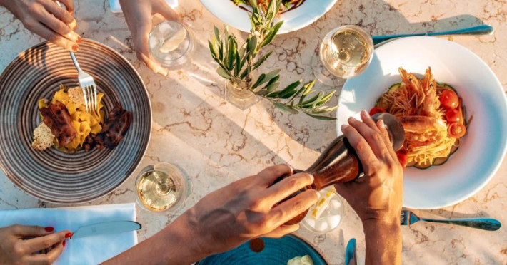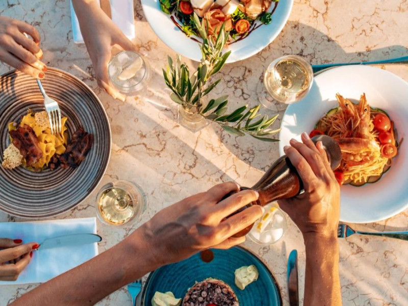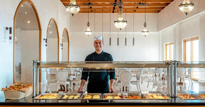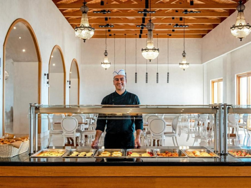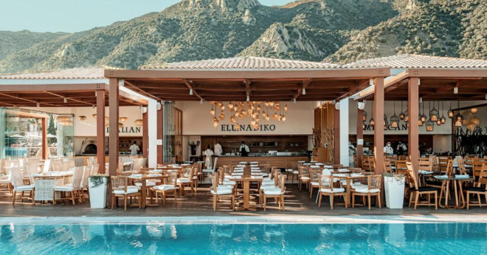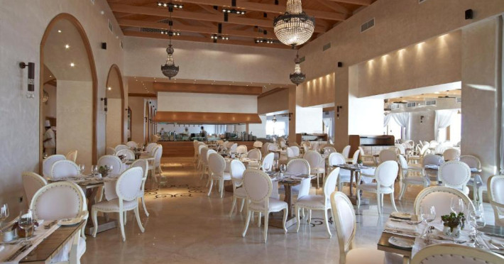 Restaurantul principal servește mic dejun tip bufet american și mic dejun continental devreme, precum și pranz și cină. Toate mesele sunt servite in stil bufet cu bucătărie deschisă. In fiecare seară, oaspeții au posibilitatea de a gusta specialități din bucătăria grecească și internațională, precum specialități italiene, panasiatice și Tex-Mex. Sushi, Ouzeri Burger Inn, Healthy Corner, Pita Corner, pită tradițională și un colț de patiserie sunt, de asemenea, disponibile la proprietate.