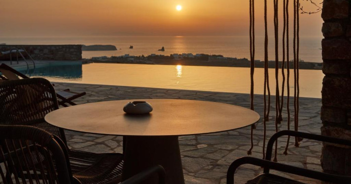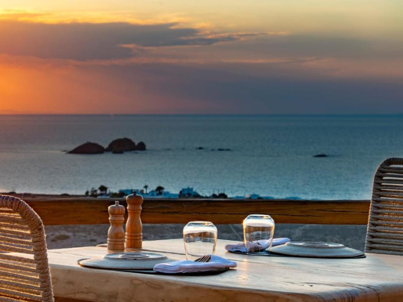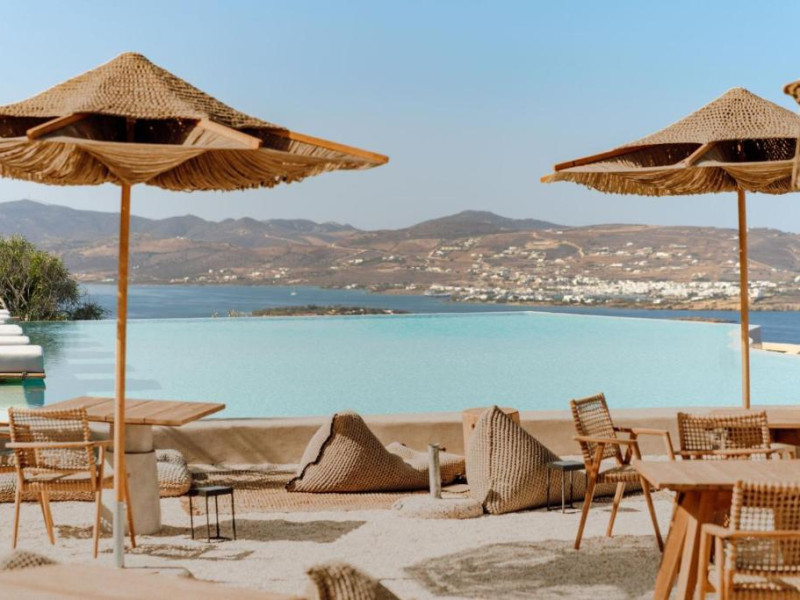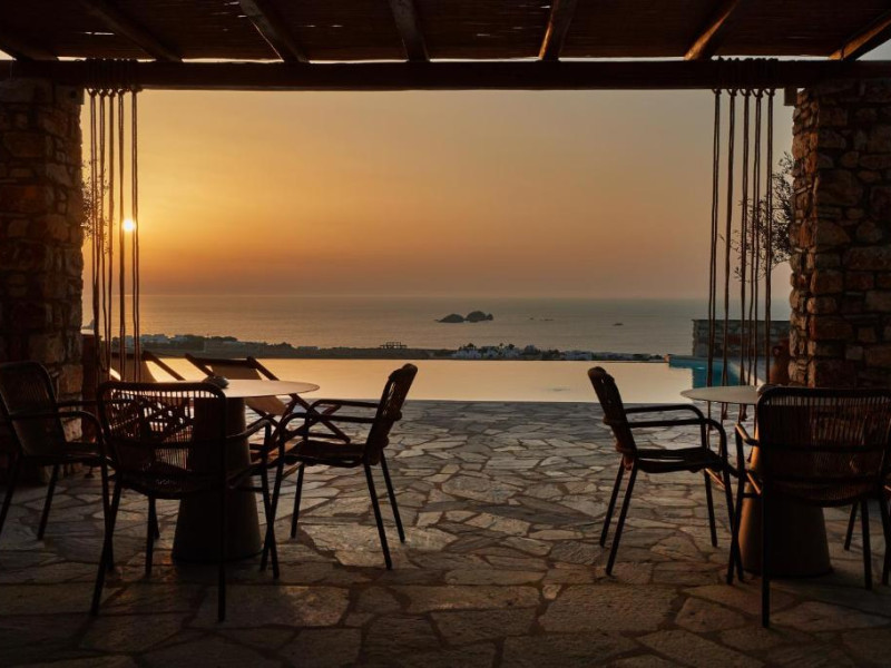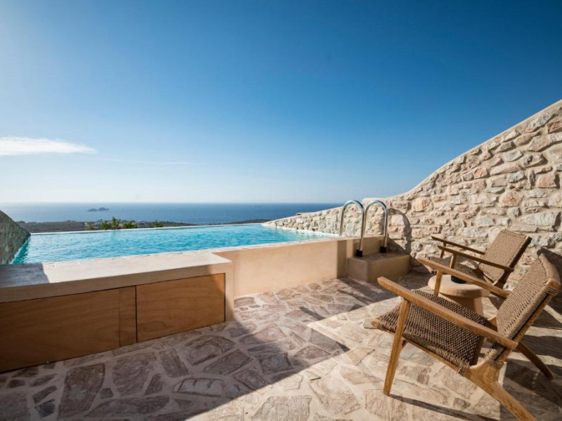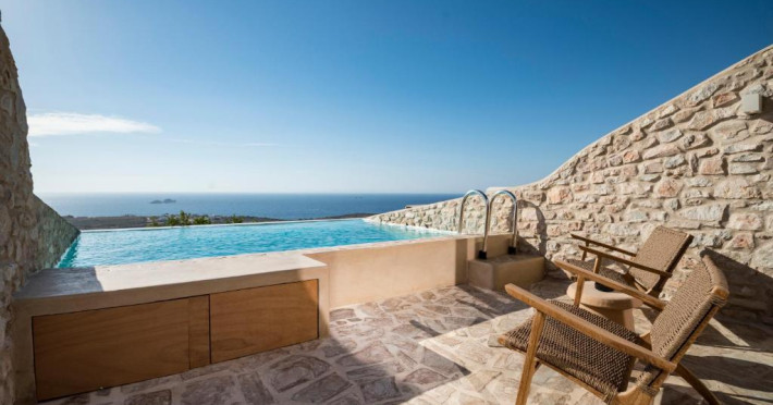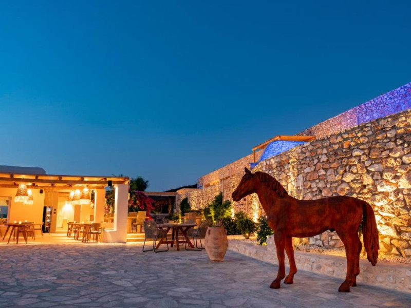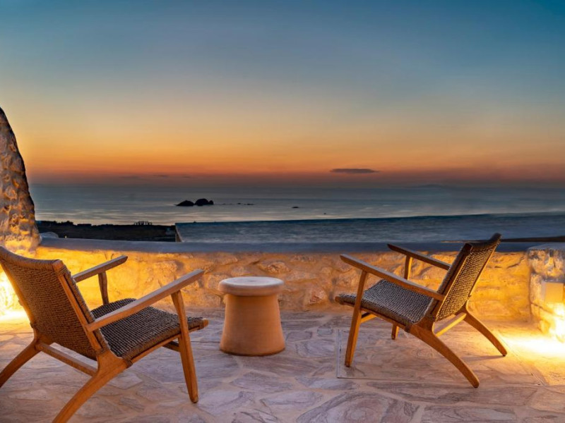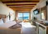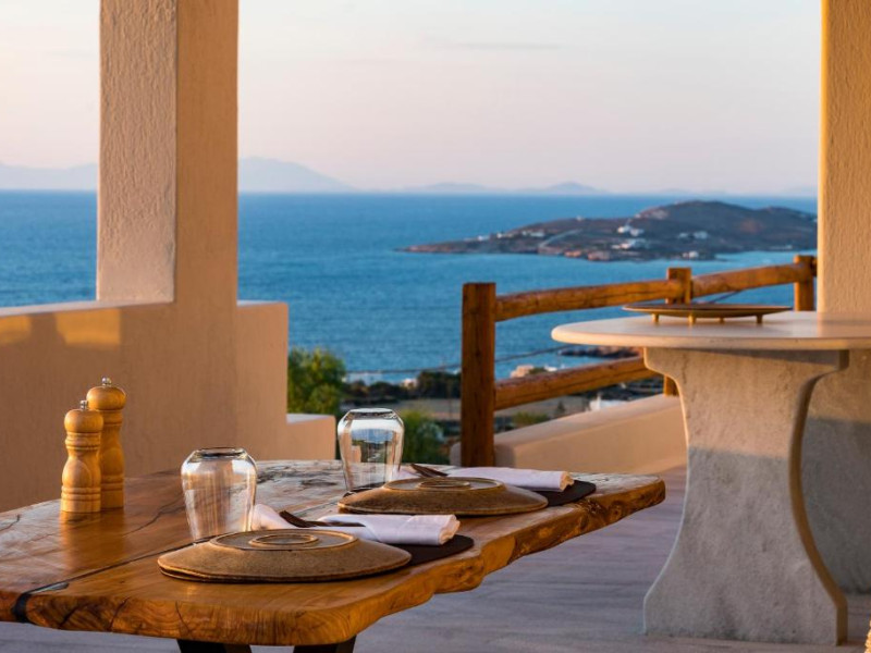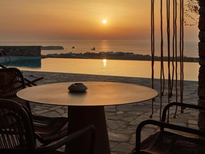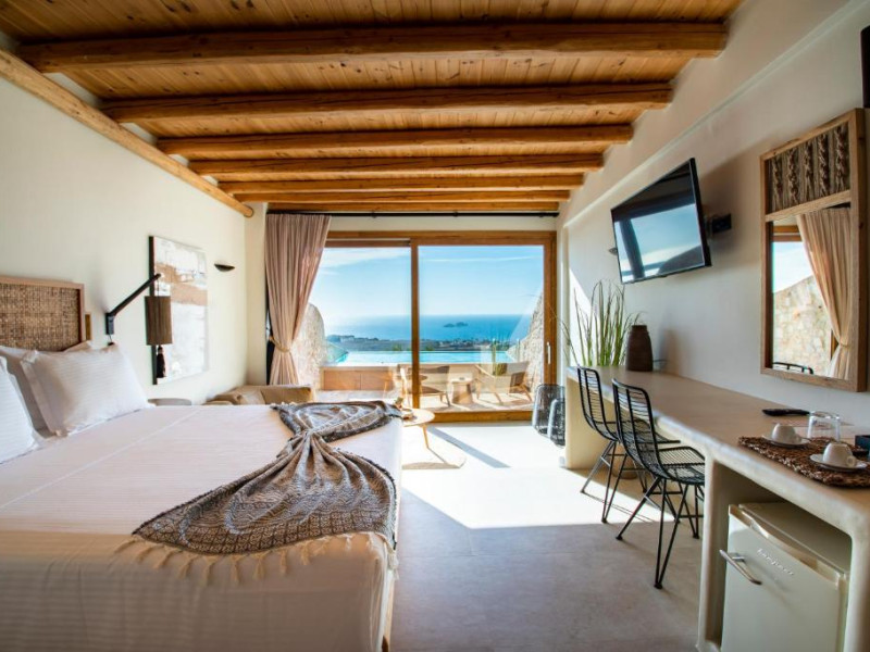 Camerele elegante beneficiază de terase private cu vedere spre Marea Egee, iar piscina infinity oferă un cadru perfect pentru momentele de relaxare. Restaurantul hotelului servește preparate mediteraneene rafinate, cu accent pe ingrediente locale și fructe de mare proaspete.