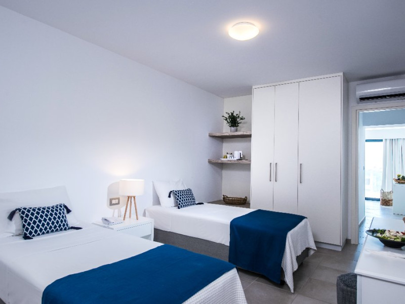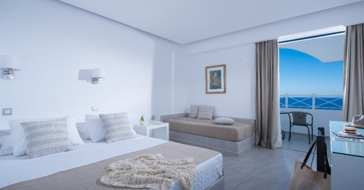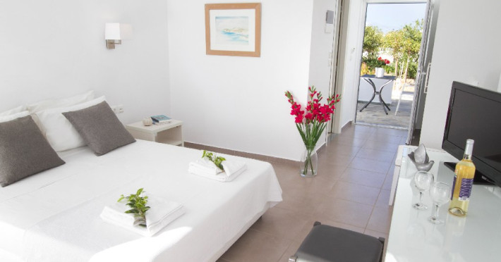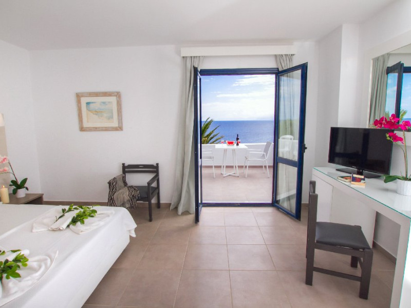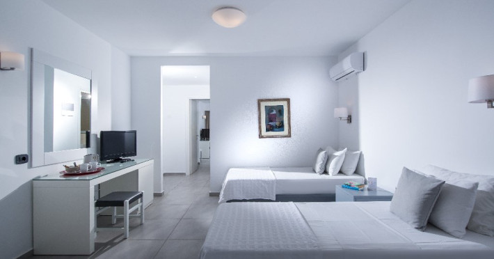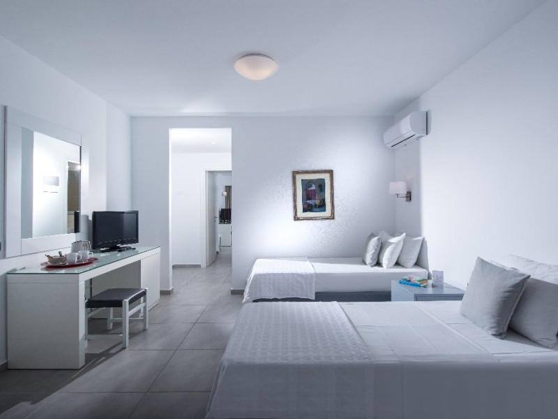 Dotari camere: Hotelul dispune de 250 de camere duble si 16 camere family amenajate in stil traditional cretan si dotate cu telefon, frigider, radio, aer conditionat, balcon/terasa.