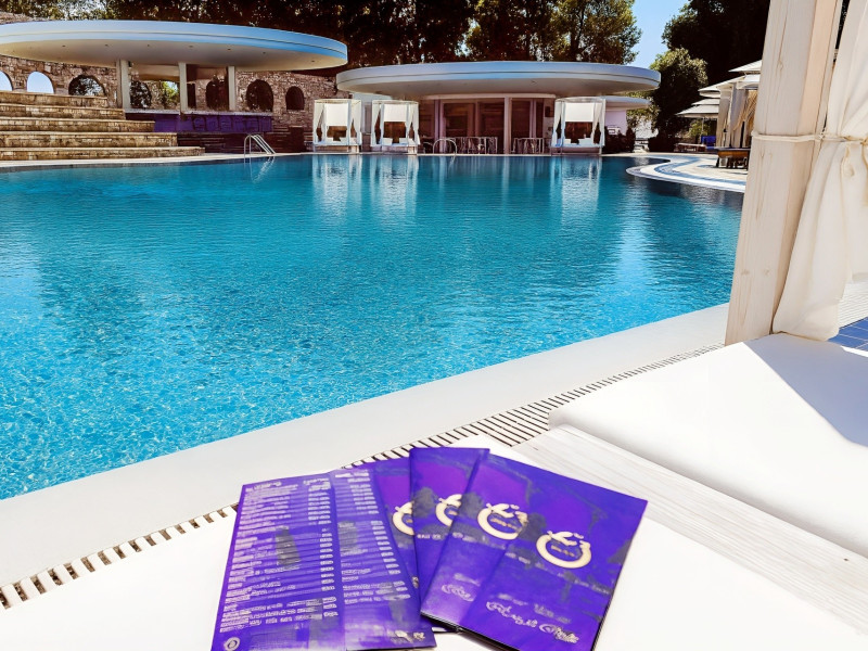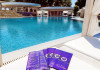 Bar la piscina: bauturi racoritoare locale, sucuri, apa, cafea, bere la halba, vin, ouzo, whisky, vodca, rom, gin – toate locale, cocktailuri simple alcoolice si fara alcool, 10:30-12:30 gustare usoara, 12:30-14:30 gustare (pizza si gyros), 15:30-18:30 gustare usoara