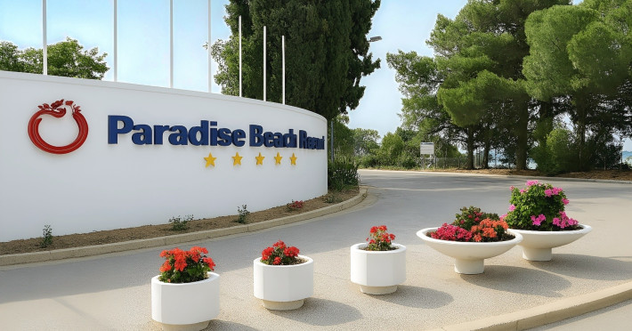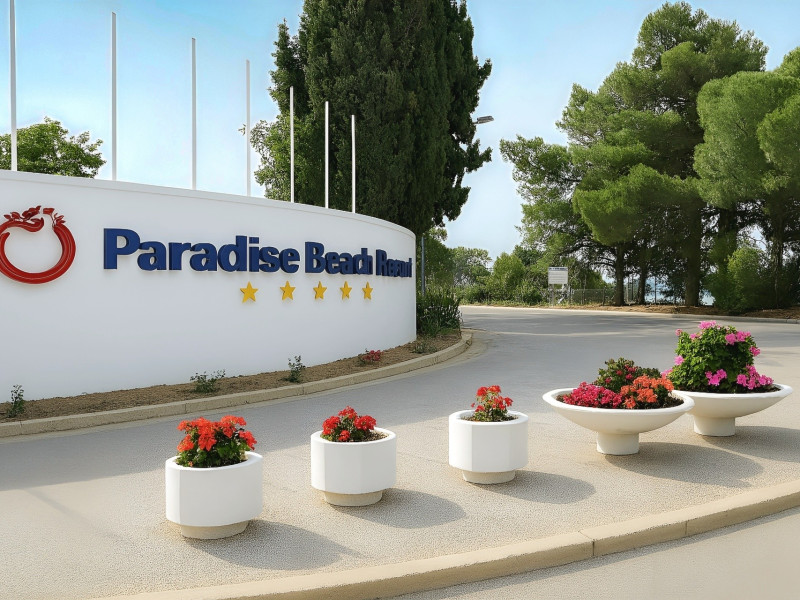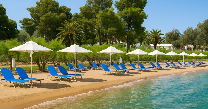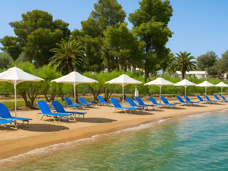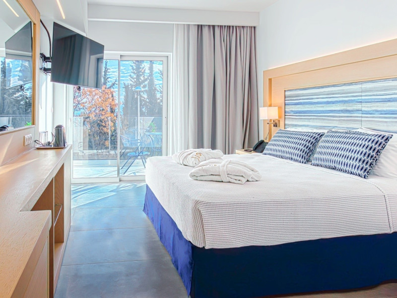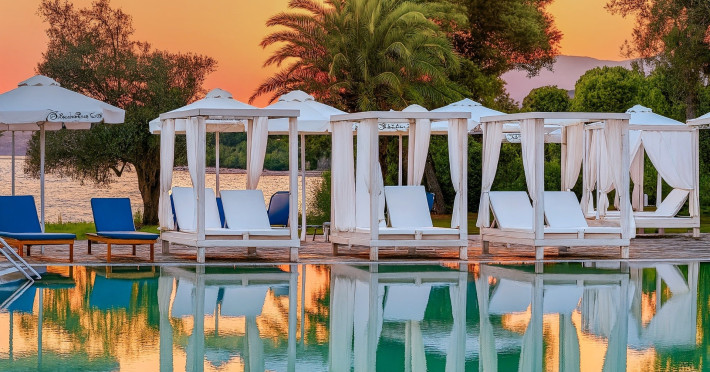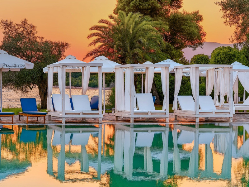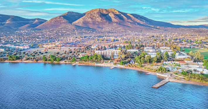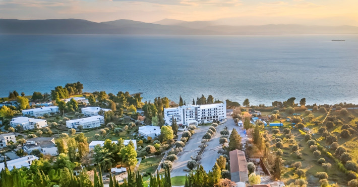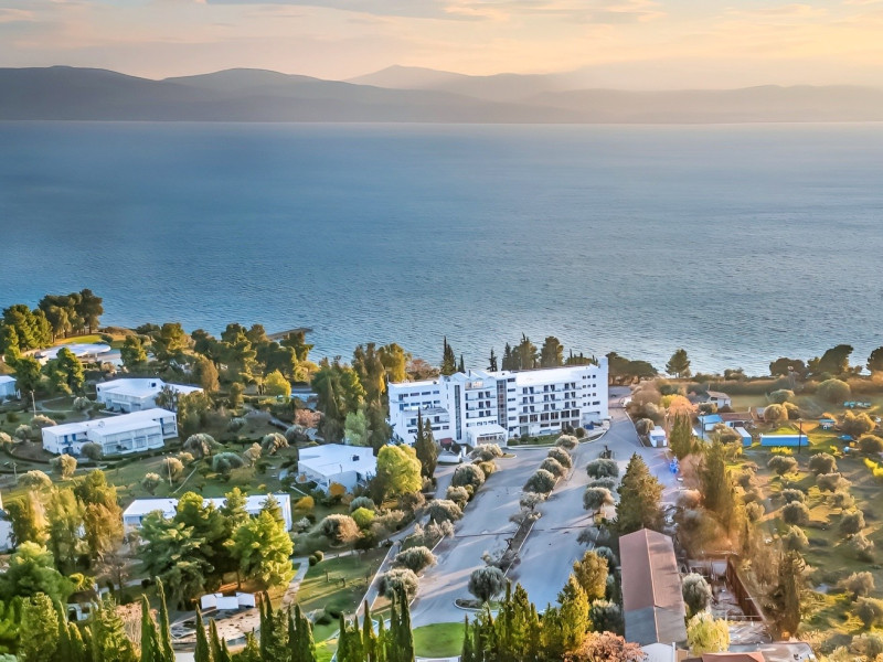 Complexul hotelier, format din cladirea principala, bungalouri la parter si mai multe cladiri cu un singur etaj, este situat intr-o gradina bine ingrijita, plina de verdeata mediteraneana. Resortul este situat chiar langa o plaja linistita cu nisip si pietris, cu vedere la insulele din jur ale Marii Egee. Datorita amplasarii sale pe coasta de est a insulei Evie, ofera conditii ideale pentru excursii in satele traditionale din jurul Eretriei si la monumente istorice precum teatrul antic sau muzeul arheologic. Ofera doua piscine in aer liber, un centru de wellness cu o gama larga de tratamente, mai multe restaurante si baruri. Datorita facilitatilor si serviciilor sale, hotelul este potrivit pentru clienti de toate varstele, inclusiv familii cu copii.