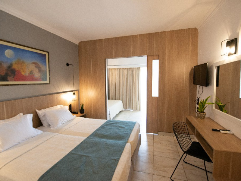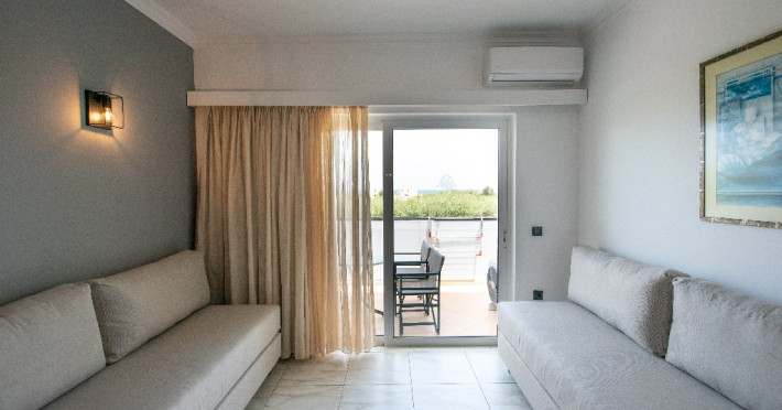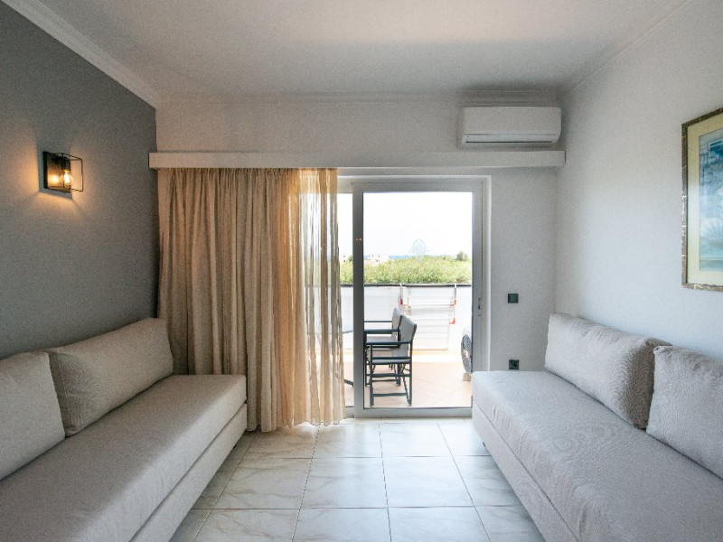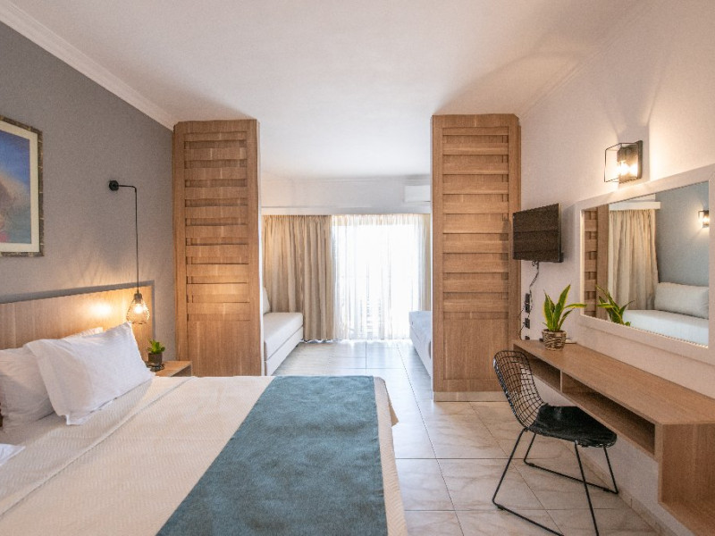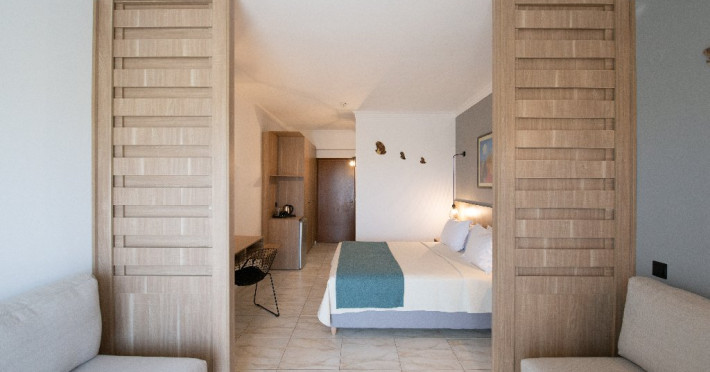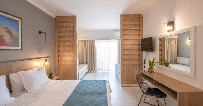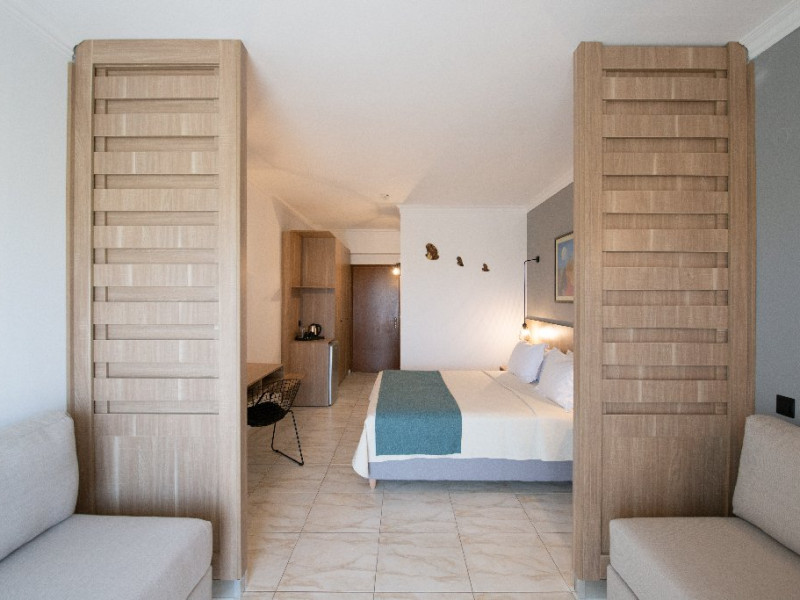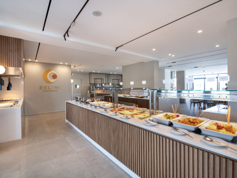 Dotari camere: Selini Suites dispune de 168 de camere de diferite tipuri (camere duble, camere family, studiouri, apartamente si maisonette) cu vedere spre gradina, piscina sau mare. Toate camerele sunt amenajate confortabil, cu atentie la detalii si sunt dotate cu:aer conditionat, seif (contra cost aprox 10 EUR/saptamana), minifrigider, televizor, internet WIFI, uscator de par, balcon sau terasa amenajata. Camerele family sunt alcatuite dintr-un dormitor si o camera de zi cu canapea extensibila se pot caza maxim 4 persoane, camerele de tip studio au o singura incapere alcatuita dintr-o zona de living (cu canapea) si zona de dormitor (cu pat matrionial sau 2 paturi simple).