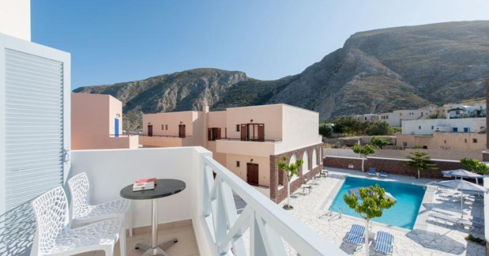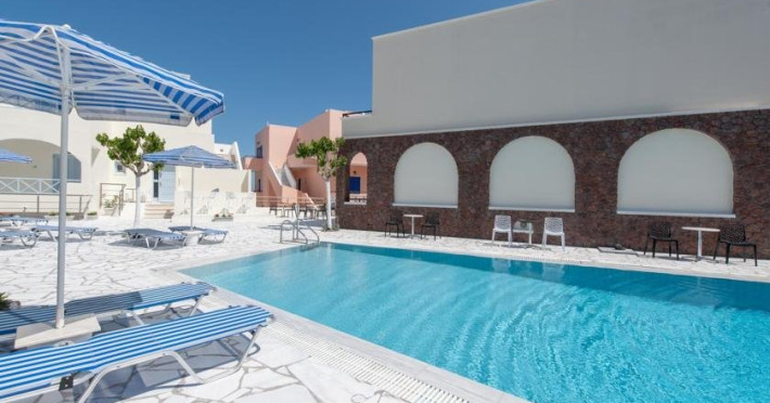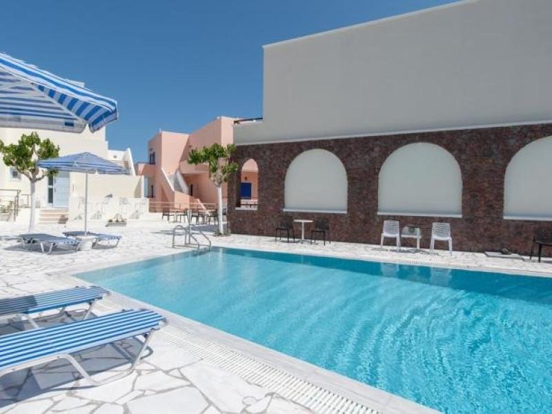 Plaja: Situata la 250m de hotel, plaja din Kamari este cu nisip negru, granulat, iar umbrelele si sezlongurile sunt contra cost