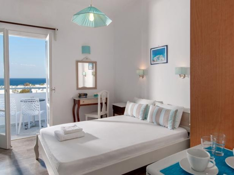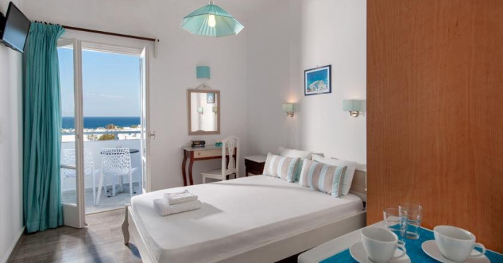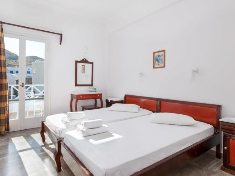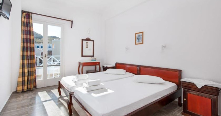 Dotari camere: La HOTEL SYRIGOS SELINI beneficiati de camere dotate cu: aer conditionat (contra cost), TV satelit, frigider, seif (contra cost), baie proprie, balcon/terasa.