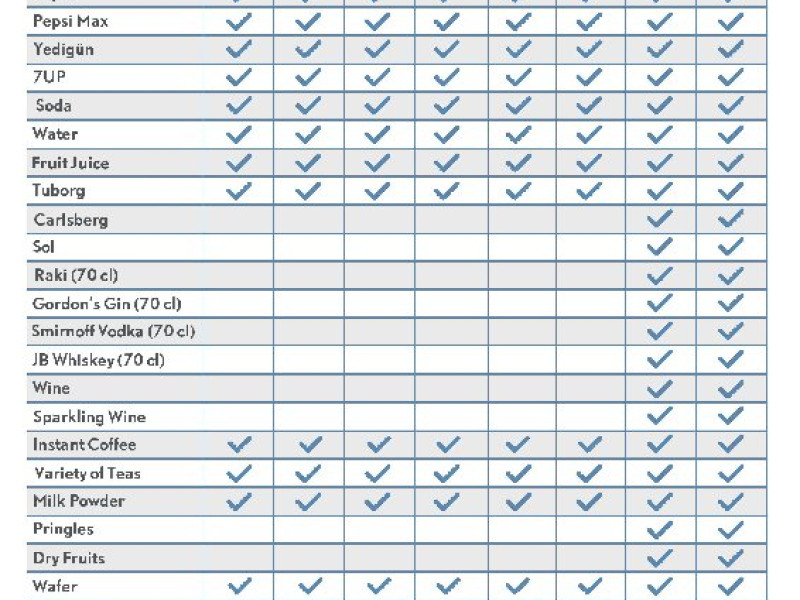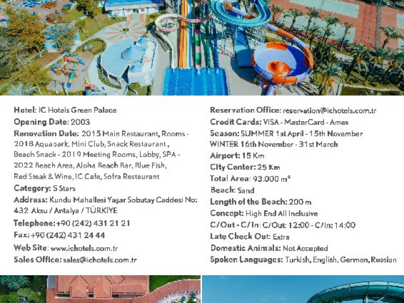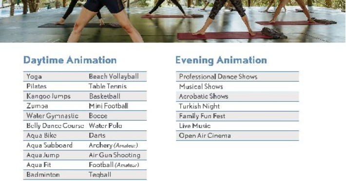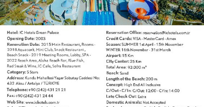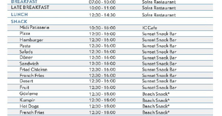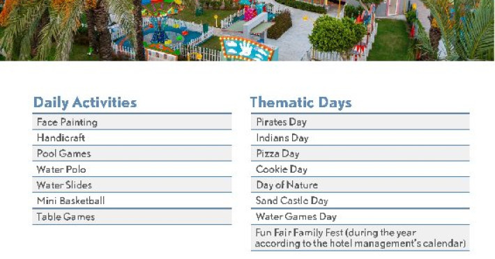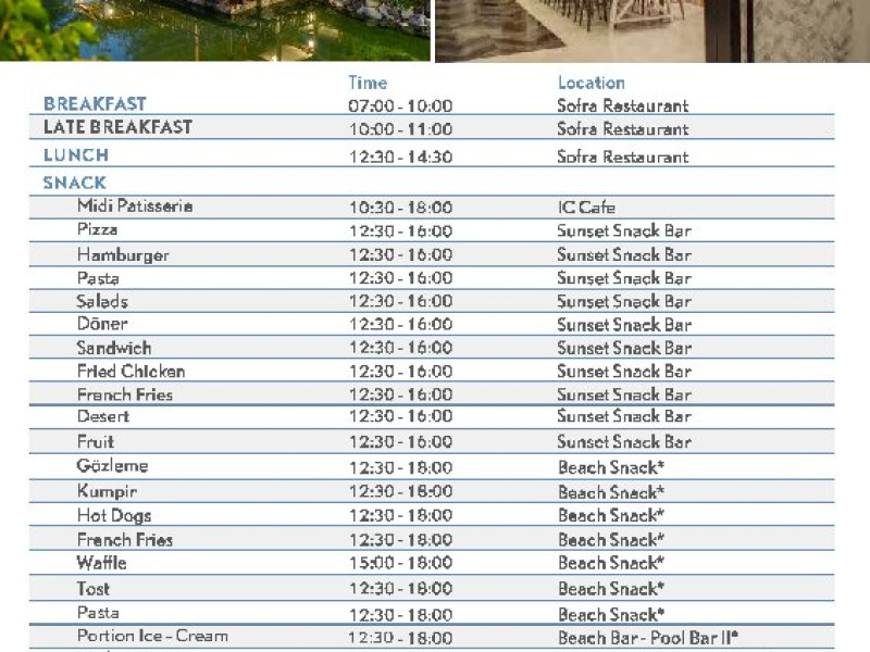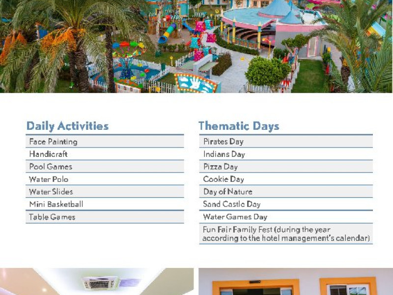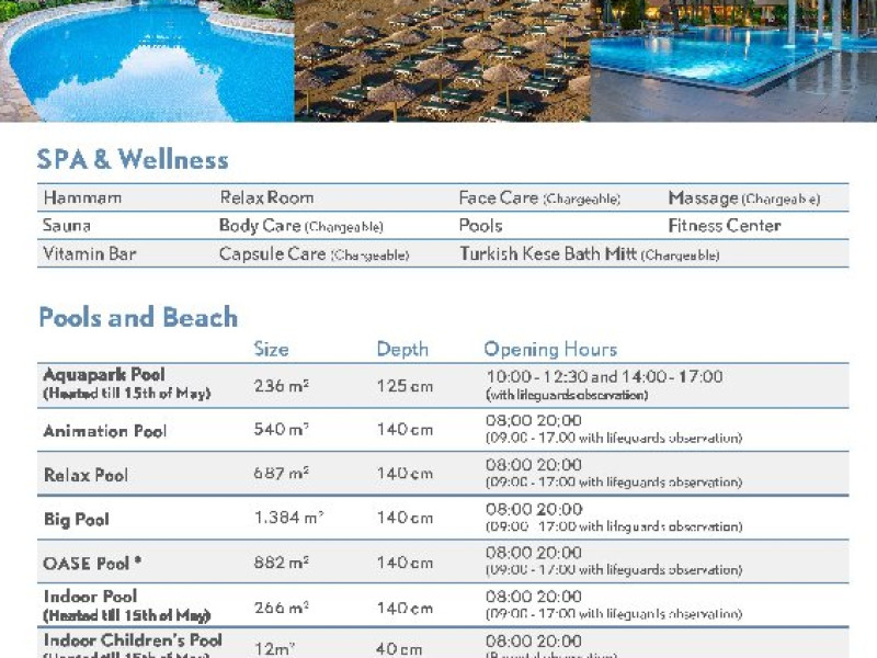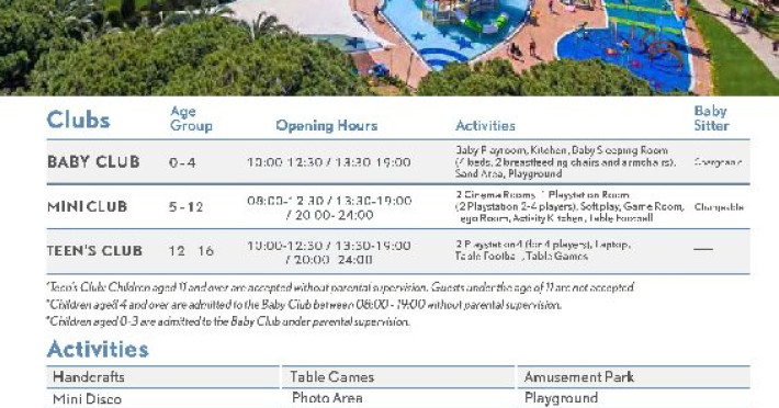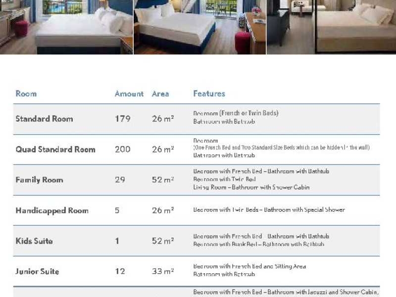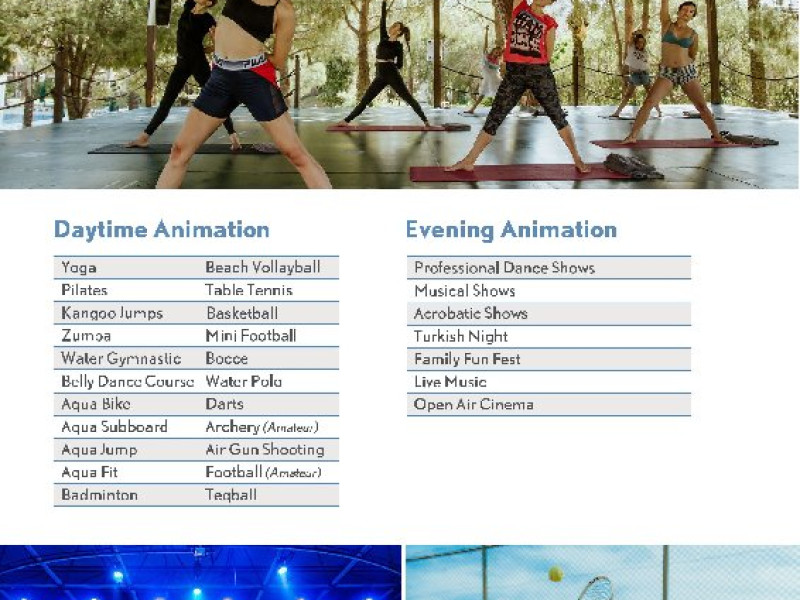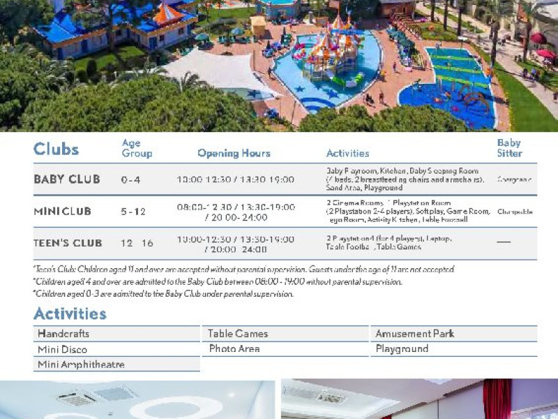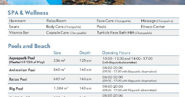 Facilitati hotel: Hotelul ofera oaspetilor sai urmatoarele facilitati: restaurant principal, 6 restaurante a la carte (italian, oriental, japonez, mexican, turcesc, pescaresc), baruri, cafenea, inghetata, piscine exterioare, piscina cu tobogane, piscina pentru copii, piscina interioara pentru adulti si copii, aerobic, aquagym, centru fitness, centru Spa, hammam, sauna, squash, terenuri de tenis, tenis de masa, mini golf, volei pe plaja, wind surfing (cu licenta), programe de animatie, pilates, dansuri latino, stretching, darts, seara turceasca, petreceri pe ponton, muzica live, karaoke, mini club pentru copii, activitati tematice, internet wi-fi.