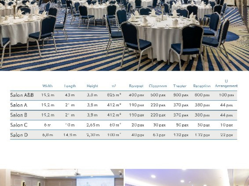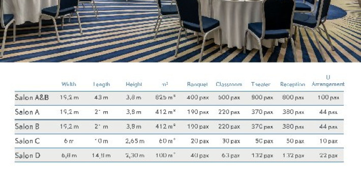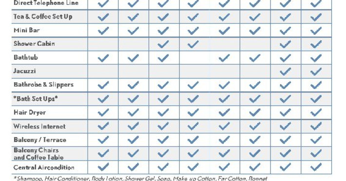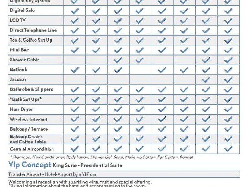 Dotari camere: Camerele hotelului dispun de: telefon, televizor LCD, seif, minibar, aer conditionat centralizat, baie cu cada sau cabina de dus, uscator de par, halat de baie si papuci, internet wireless, facilitati pentru prepararea ceaiului si cafelei, mocheta, balcon sau terasa.