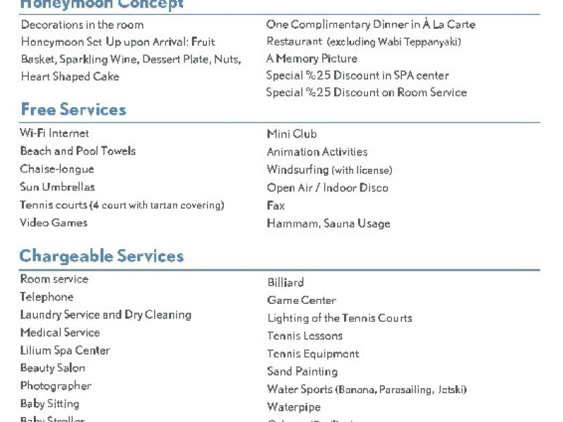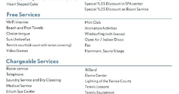 Servicii cu plata: rezervare pentru restaurantele a la carte, room service, internet cafe, servicii medicale, babysitting, tratamente in centru Spa, masaje, lectii de tenis, nocturna si echipament pentru tenis, narghilea, jocuri video, biliard, bowling, sporturi acvatice, servicii de spalatorie si curatatorie, magazine, coafor, sali de conferinta.