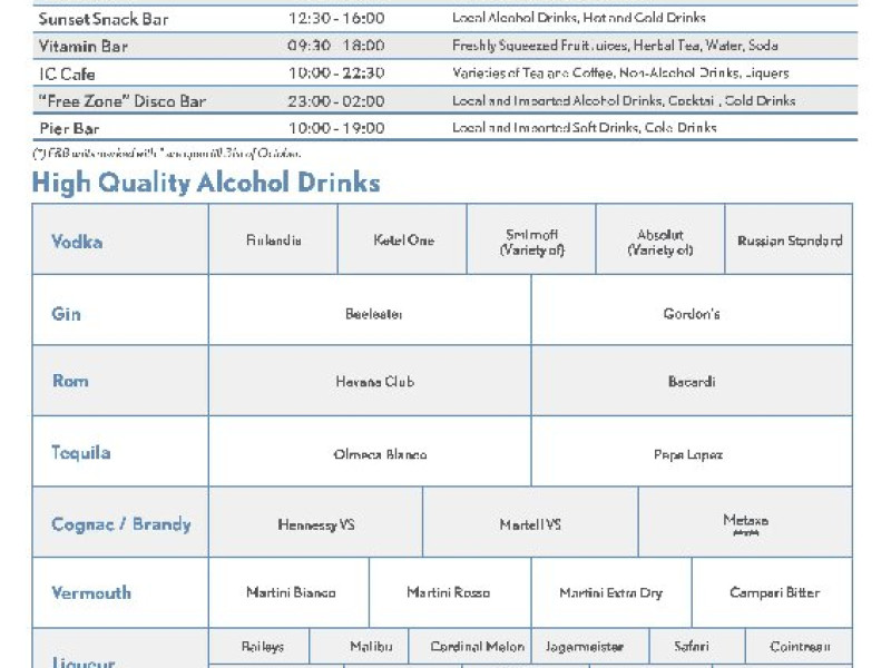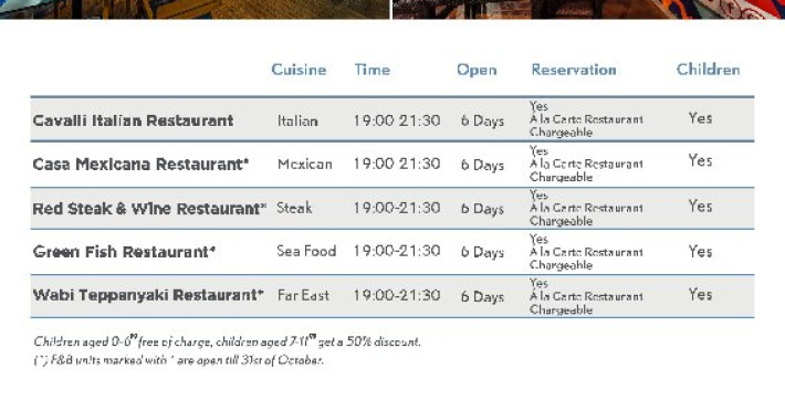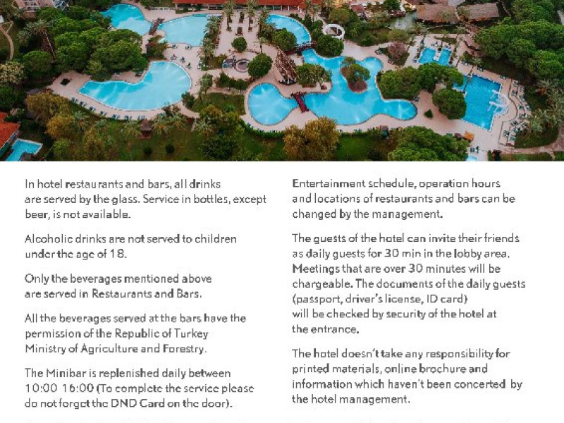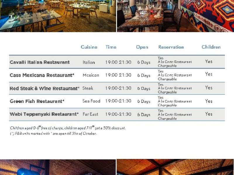 Alte informatii: animalele de companie nu sunt permise; in restaurante tinuta este obligatorie; accesul in restaurantele a la carte se face in baza unei rezervari; in functie de conditiile meteorologice, programul de functionare a restaurantelor si barurilor se poate modifica; hotelul isi rezerva dreptul de a modifica conceptul in timpul sezonului fara a anunta in prealabil aceste modificari.