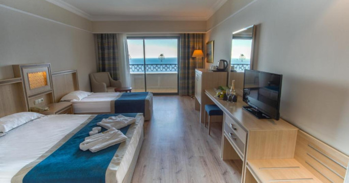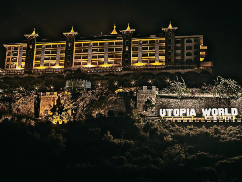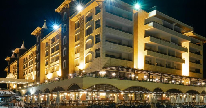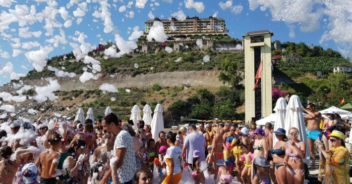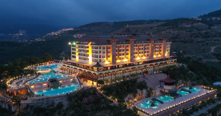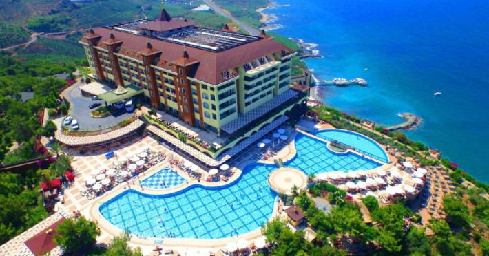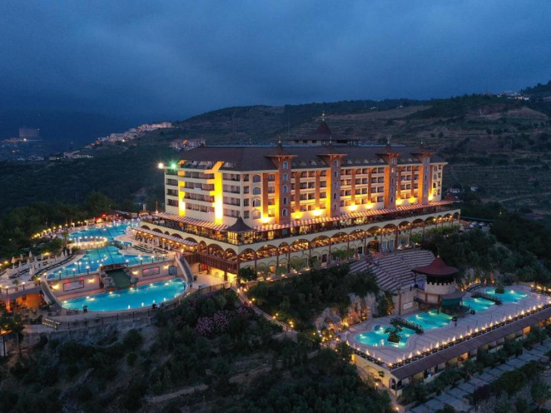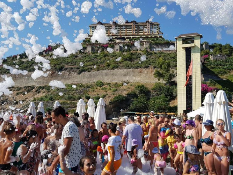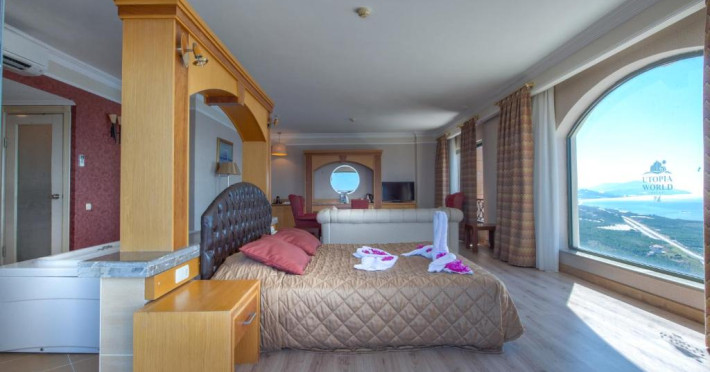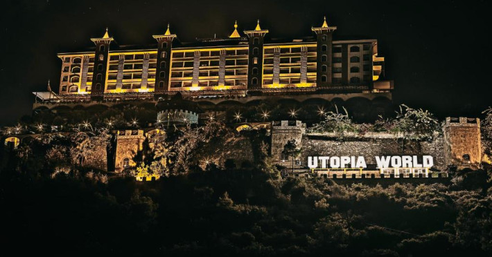 Hotelul Utopia World este situat pe un varf de stancă de pe Coasta Alanya si are vedere la Marea Mediterană. Numeroasele sale facilități includ o plajă privată cu steag albastru, cu 2 pontoane, piscine in aer liber cu un aquapark de 15.000 m² și un centru spa cu hamam tradițional. Situat in orașul antic Syedra, Utopia World oferă cazare de 5 stele.