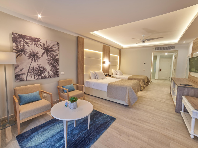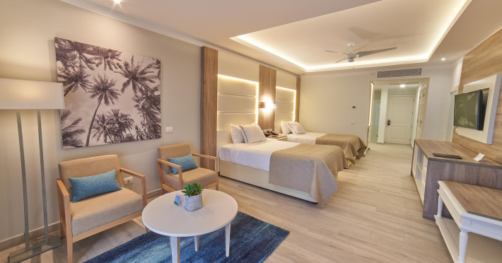 Junior suite deluxe: baie cu toaleta (jacuzzi, uscator de par), aer conditionat, ventilator, telefon, TV/satelit, filtru de cafea, seif, balcon sau terasa, minibar, halat de baie si papuci.