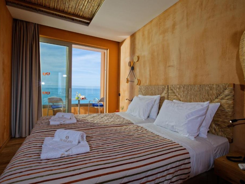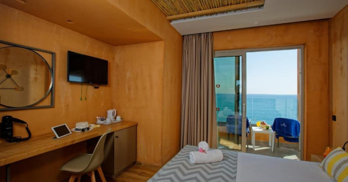 Dotari camere: Cele 147 de camere sunt de 4 categorii: camere single de 15-16 mp (max 1 pax), camere duble economice de aprox. 15-16 mp (max 2 pax), camere duble cu vedere la mare sau spre curtea interioara de 16 mp (max 2+1 pax) si camere duble superioare cu vedere la mare sau spre curtea interioara de 18 mp (max 2+1 pax). Toate camerele dispun de aer conditionat, wi-fi gratuit, telefon, seif (cu plata), TV satelit, frigider, baie privata cu dus, uscator de par, balcon.